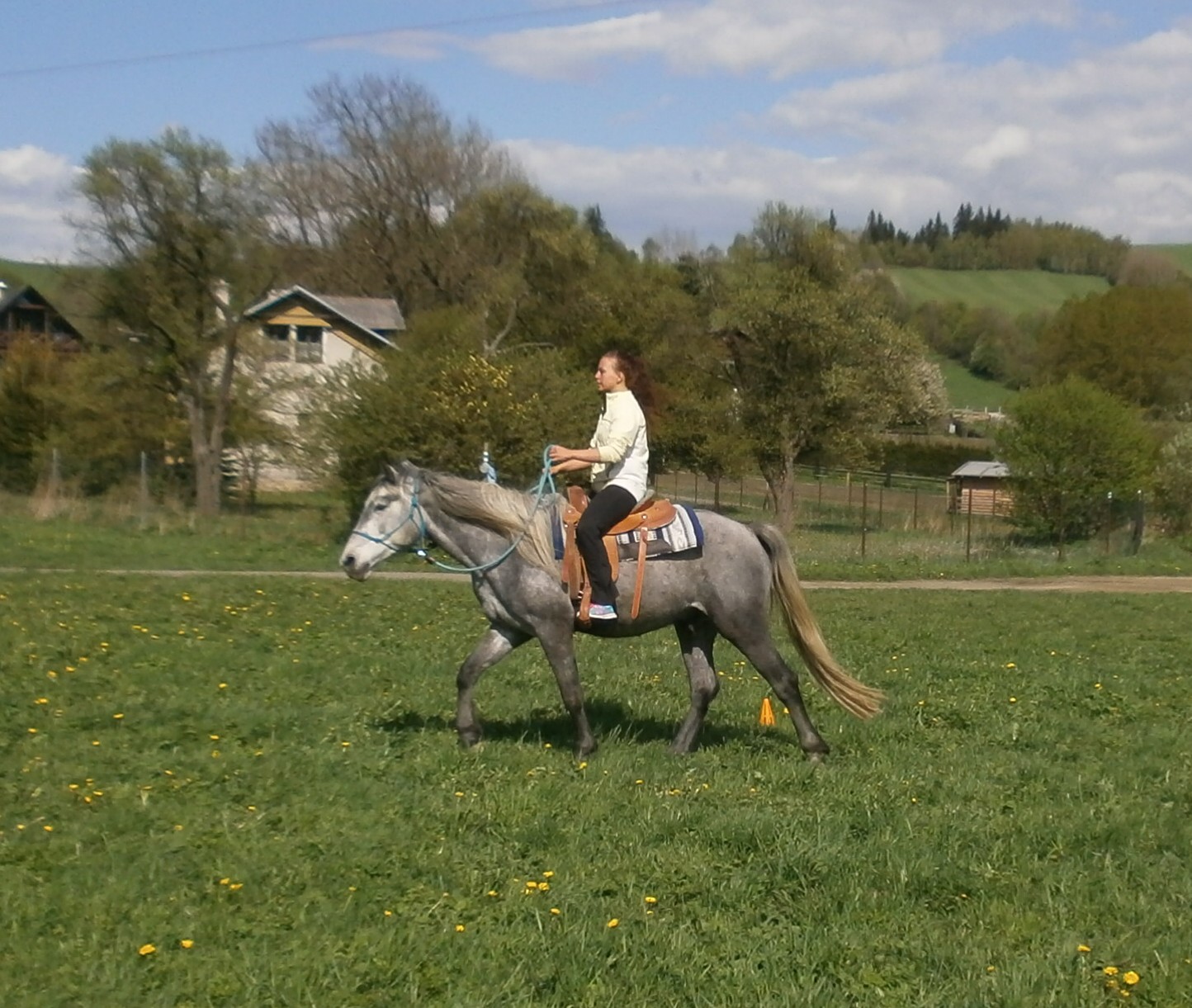 Ve 3. letech jsme Luckyho prodali skvělým majitelům. Žije u nich na pastvině s přístřeškem společně s parťákem haflingem. Z Luckyho je spolehlivý rekreační kůň a se svou mladou majitelkou se toulá přírodou pod westernovým sedlem na pareliho ohlávce bez udidla...